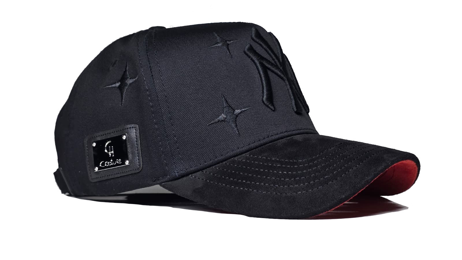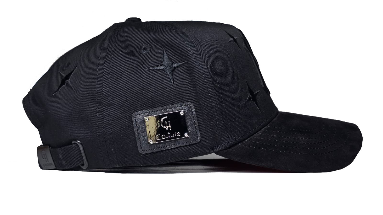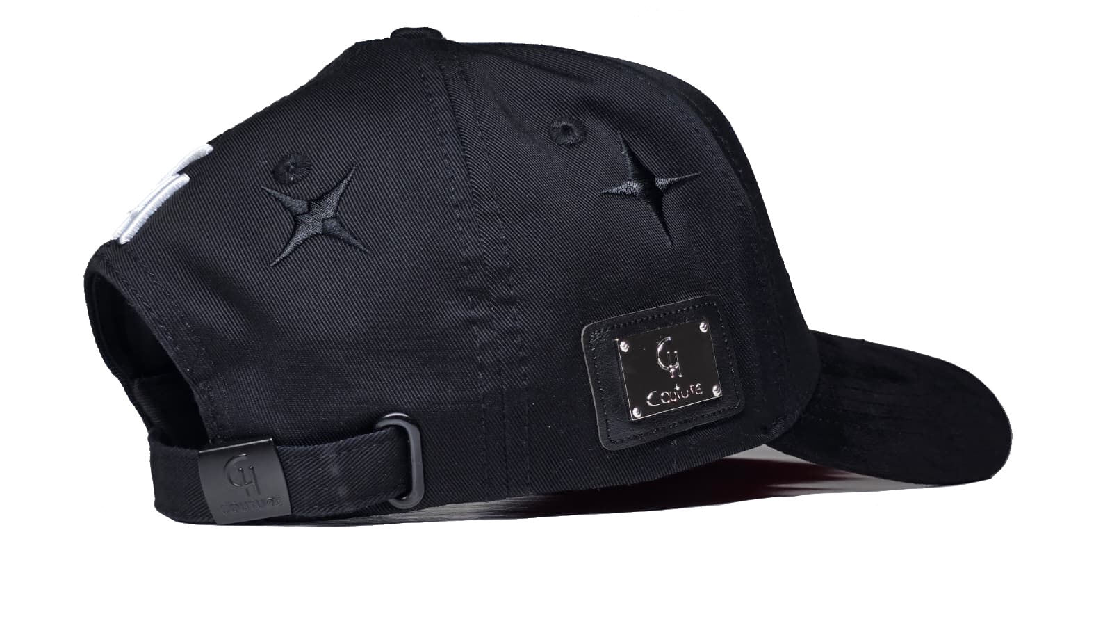 detalles de metal y cuero al lado derecho de la gorra.
