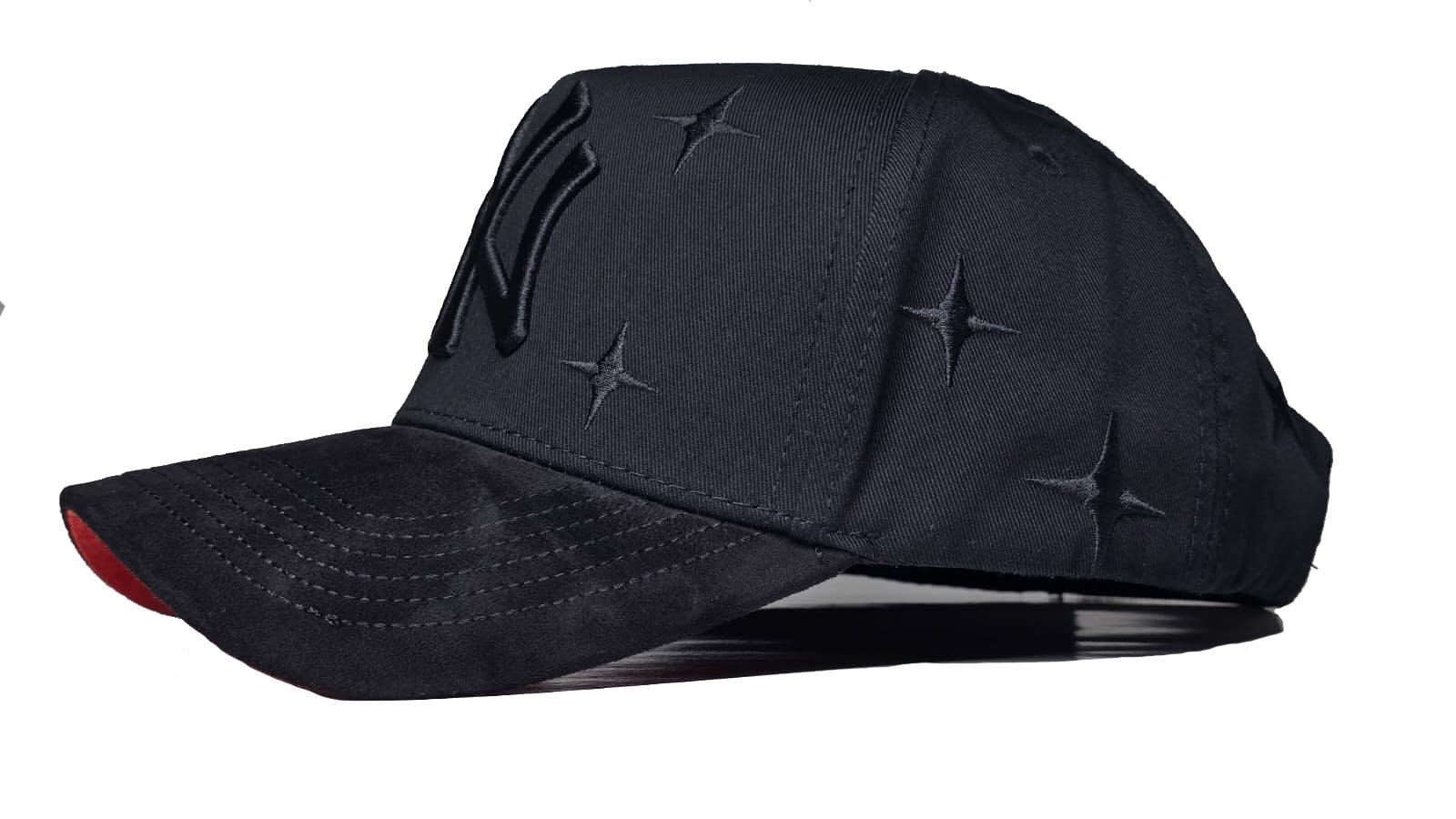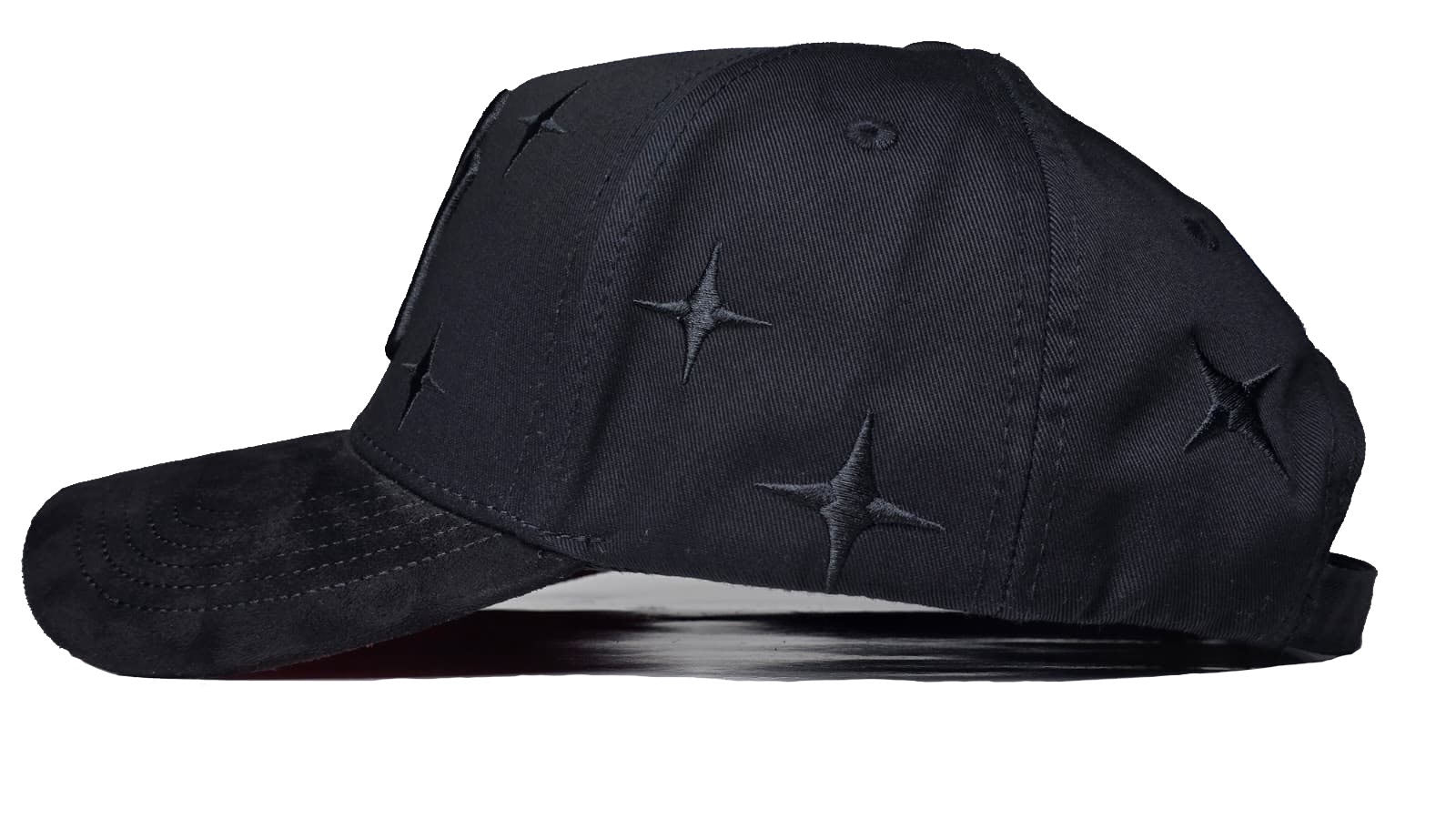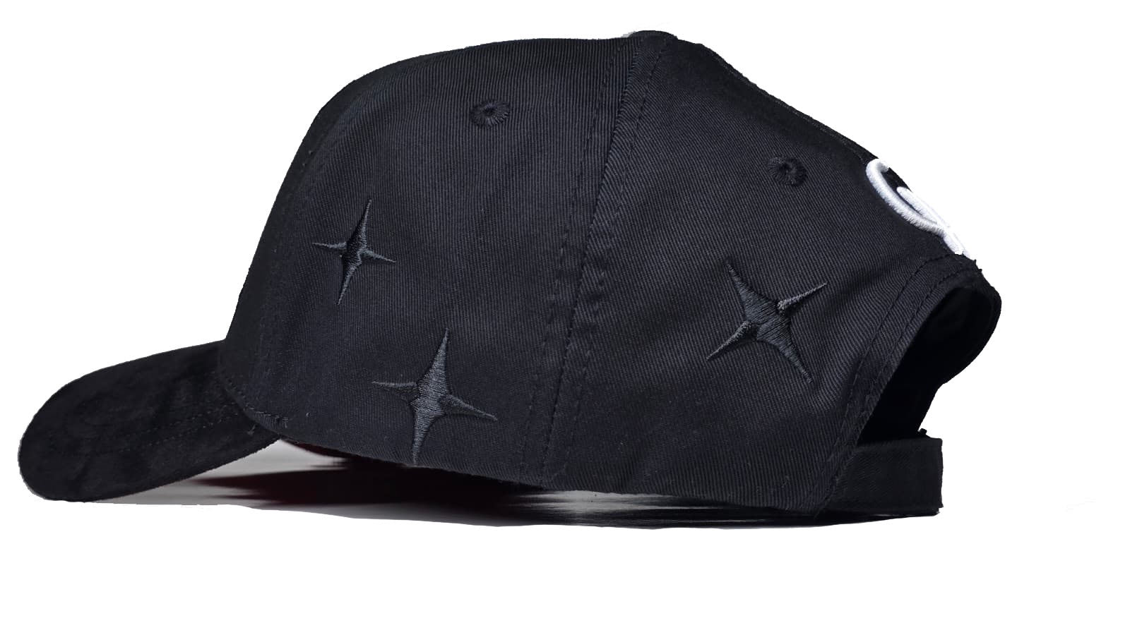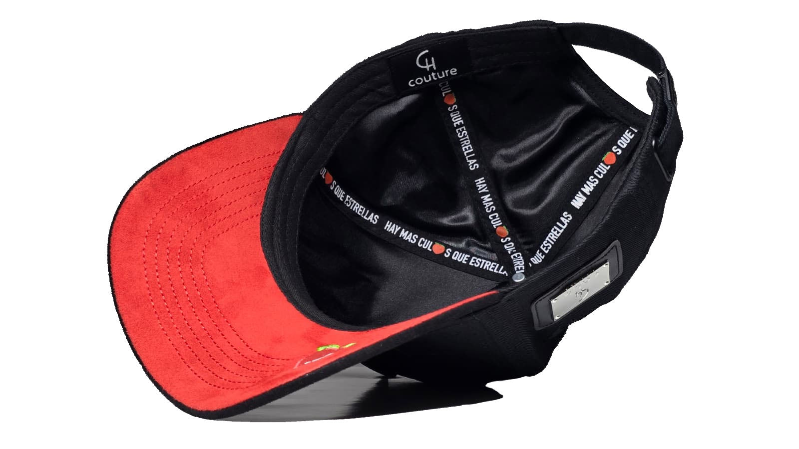 detalles de metal y cuero al lado derecho de la gorra.